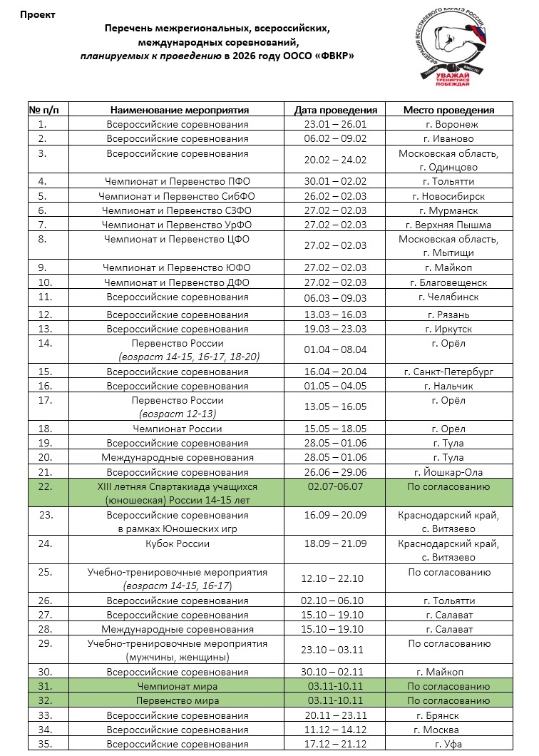 Проект перечня межрегиональных, всероссийских и международных соревнований, планируемых ООСО «ФВКР» к проведению в 2026 году